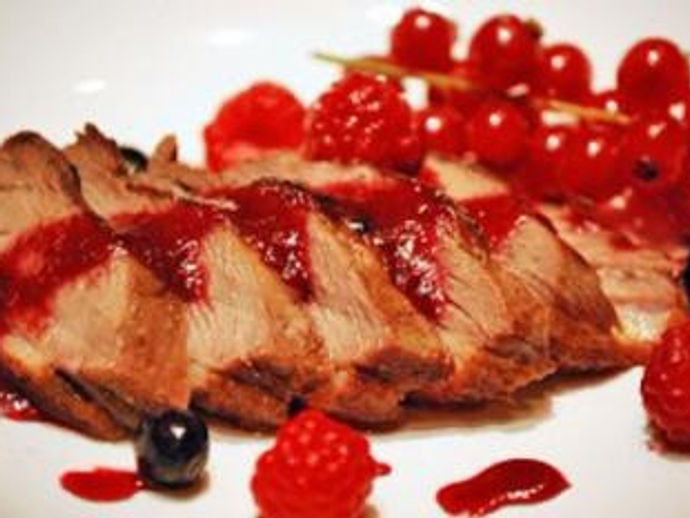 Рецепт: Грудки (гусиные) - 2 шт. Клубника - 100 г Ежевика - 50 г Малина - 100 г Черника - 50 г Сливочное масло - 1 ч.л. Сухое вино...
